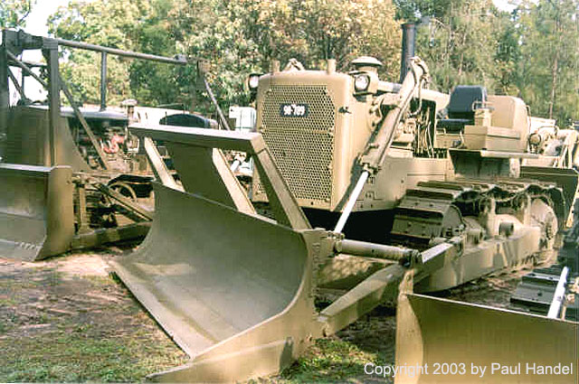 A Caterpillar D* Dozer fitted with angled Rome plough. This type of blade was used in South Vietnam by the Royal Australian Engineers during land clearing operations. The dozer is yet to be fitted with its Vietnam era roll over protection cage. |