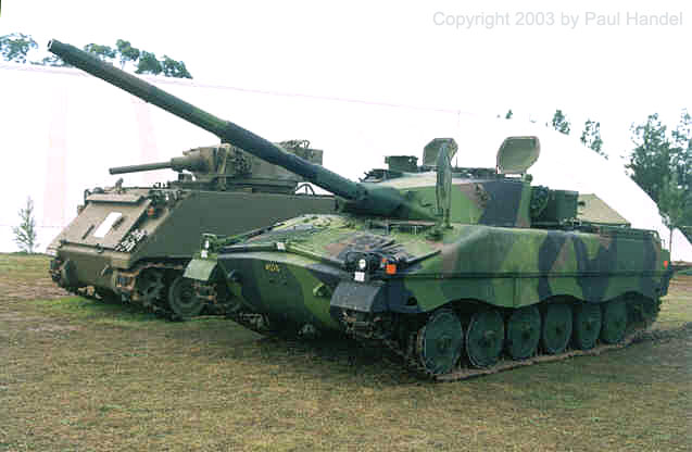 The Swedish Ikv 91 Tank Destroyer alongside the M113A1 Fire Support Vehicle (Saladin Turret). The sleek lines of the Ikv and long gun tube contrast with the rather angular shape of the M113. |